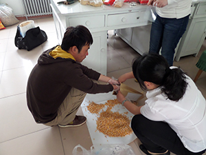 这次国家储备的主要是玉米种子和大豆良种,工作人员按照科学的采样依据进行采样分装。
